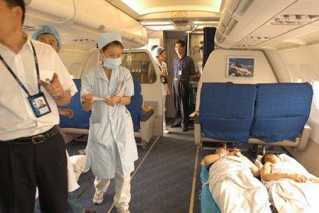 5月20日15時36分,四川航空一架空客A321飛機從成都起飛,經(jīng)兩個小時的飛行,將36名傷員運抵廣州,這是民航首次實施整機客艙安置醫(yī)療擔架。