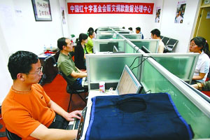 王汝鵬用“井噴式的捐款”來(lái)形容這次的捐款狀態(tài)。他說(shuō),常態(tài)時(shí),紅基會(huì)平均每天接受幾十或上百筆捐款。而地震發(fā)生后,每天捐款數(shù)額激增到五六萬(wàn)筆!