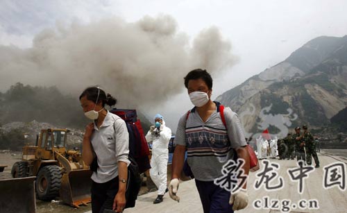 居民離開映秀鎮(zhèn),背后升起爆破拆除房屋而產生的濃煙。記者 韓億國攝 (來源:彩龍中國)