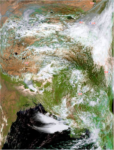 從北京、廣州、烏魯木齊、佳木斯4個氣象衛(wèi)星地面站接收到風云三號A星第一軌可見光圖像中可以明顯看到,云圖右側的西北地區(qū)東部、西南地區(qū)東部以及青藏高原東北部受過境鋒面系統(tǒng)影響,被白亮的云系覆蓋;云系南側,包括四川地震災區(qū)在內的盆地地區(qū)為層狀云覆蓋;云圖左側青藏高原其他地區(qū)上空云量較少,地表清楚,青海湖、哈拉湖、納木錯、色林錯等水體清晰可辨。