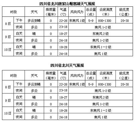 天氣預(yù)報:預(yù)計8至13日,地震災(zāi)區(qū)主要以多云或晴為主,有時有小陣雨,氣溫較高,濕度較大,其中,四川成都、綿陽、德陽、廣元以及甘肅文縣、陜西略陽、寧強等地日最高氣溫可達27~32℃,帳篷內(nèi)溫度34~40 ℃,四川汶川、茂縣、理縣日最高氣溫可達24~27℃,帳篷內(nèi)溫度28~33℃。注意采取防暑降溫措施。