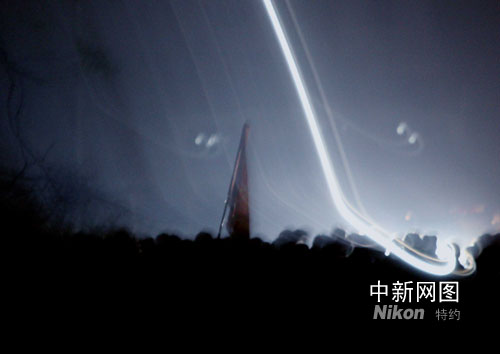 失事直升機部分遇難者遺體,由四川省軍區(qū)的阿壩軍分區(qū)和雅安軍分區(qū)預備役官兵日夜搶運。于十三日子夜零點時分先后運抵四川省映秀鎮(zhèn),圖為在映秀鎮(zhèn)外高山上出現(xiàn)運送隊伍的微弱燈光(右下角)。作者:賈國榮