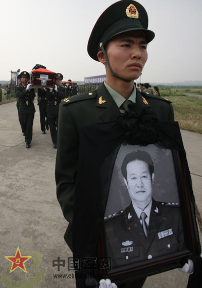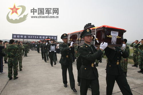 今天上午10時30分,運送失事直升機機組成員靈柩的汽車,緩緩駛進某陸航團鳳凰山機場。迎送烈士靈柩儀式正式開始。