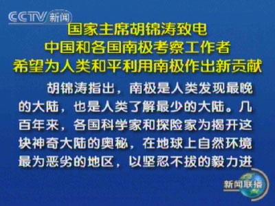 中新網6月21日電 據(jù)中央電視臺新聞聯(lián)播消息,6月21日是南半球的“冬至”,也是南極洲的重要傳統(tǒng)節(jié)日仲冬節(jié)。今天,中國國家主席胡錦濤發(fā)出慰問電,代表中國政府和中國人民,并以他個人名義,向在南極漫長極夜中勤奮工作、頑強拼搏的中國南極長城站、中山站的全體考察隊員,向奮斗在南極地區(qū)的各國科學家和工程技術人員致以誠摯的問候,祝他們仲冬節(jié)快樂。