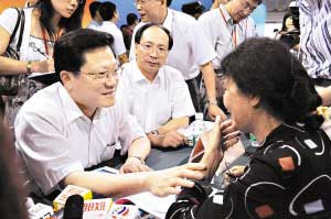 記者發(fā)現(xiàn),社會與勞動保障局和國土房管局的接訪點前“人氣”極旺,隊伍都排到了別的局“攤位”前。當然,全場最忙的要屬市長張廣寧。由于要跟他“面談”的市民太多,警察不得不筑起一道人墻,留出一條市民排隊的通道以維持現(xiàn)場秩序。