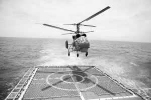 “方位××度,距離××鏈,目標(biāo)正在急速突破我海區(qū),請求直升機突擊!”接到命令,空中反潛直升機迅速撲向目標(biāo)海區(qū)。開艙,投彈,數(shù)分鐘后,目標(biāo)被一舉擊沉。