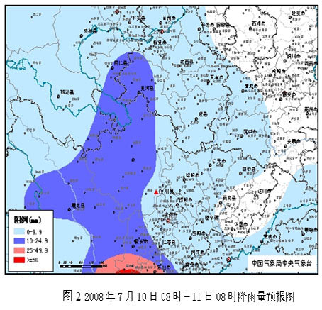 10~11日:地震災區(qū)以陰天間多云天氣為主,有陣雨或雷陣雨,雨量小到中雨,局部地區(qū)有大雨(圖2);氣溫將下降2-5℃。