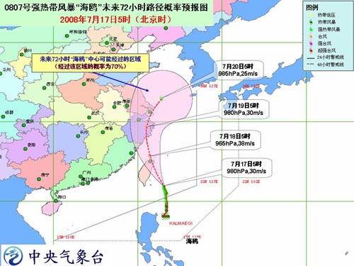 預(yù)計(jì),強(qiáng)風(fēng)暴中心將以每小時(shí)20公里左右的速度向西北偏北方向移動(dòng),逐漸向臺(tái)灣東部海面靠近,強(qiáng)度還將繼續(xù)加強(qiáng),并可能于今天夜間到明天上午在臺(tái)灣花蓮到宜蘭一帶沿海登陸,或擦過(guò)臺(tái)灣東北 部向浙閩沿?拷。