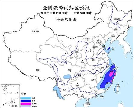 中新網7月19日電 中央氣象臺2008年7月19日06時繼續(xù)發(fā)布暴雨橙色警報:預計今天白天到夜間,福建大部、浙江、廣東東北部、江西南部和東部、江蘇南部、上海以及山東半島等地有暴雨,其中,福建北部、浙江中南部等地的部分地區(qū)有大暴雨。