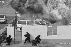 在指揮員下達攻擊令的余音聲中,突擊分隊兵分5路向目標發(fā)起攻擊:從地下鉆出的特戰(zhàn)隊員,對大廳兩名歹徒實施了無聲射殺,迅速排除了出入口爆炸物,為救援行動打開了通道?罩写菇档奶貞(zhàn)隊員從天窗潛入“歹徒”所在的樓層,乘坐攀登突擊車的兩組隊員左右破窗,與空中垂降的戰(zhàn)友同時攻入大廳,“歹徒”未及反抗,就被一一擊斃或制服。樓頂?shù)奶貞?zhàn)隊員在對防護窗實施精確爆破后,利用繩索從天而降,破窗而入,身體騰空中,舉槍擊發(fā),“歹徒”未及反應(yīng),就已中彈斃命,人質(zhì)被安全解救。