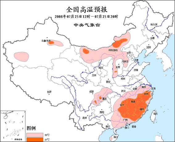 中新網(wǎng)7月25日電 中央氣象臺2008年7月25日10時(shí)發(fā)布高溫預(yù)報(bào):預(yù)計(jì)今天白天,江淮南部、江南大部、華南中東部、四川盆地東部、重慶大部以及新疆吐魯番盆地、內(nèi)蒙古中西部、山西西部和北部、河北西部等地將有35℃以上的高溫天氣.