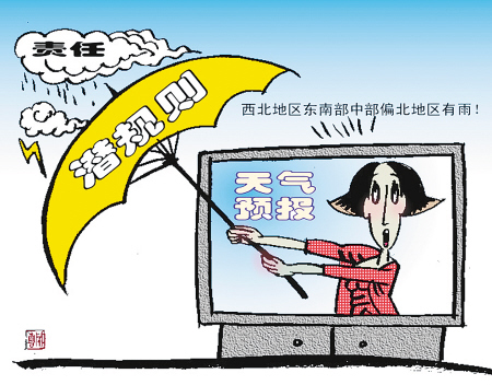 天氣預(yù)報(bào)曾被批為“四大不準(zhǔn)”之首,原來(lái)氣象專家們學(xué)會(huì)了“太極拳”,啟用了“潛規(guī)則”,以一串模糊不清的詞語(yǔ),讓百姓不知所云,自己無(wú)責(zé)一身輕了!這層窗戶紙被“業(yè)內(nèi)人士”捅破后,長(zhǎng)期被忽悠、愚弄的觀眾忍不住發(fā)問(wèn):每天黃金時(shí)間播報(bào),那么多經(jīng)費(fèi)供養(yǎng),竟然貢獻(xiàn)出這樣的東東,這節(jié)目、這專家、這部門還要它干什么?的確,天氣預(yù)報(bào)不準(zhǔn)確,百姓會(huì)很有意見(jiàn),但即使報(bào)錯(cuò)了,氣象部門也沒(méi)有哪個(gè)受到撤職或處分。民憤起于一時(shí),但很快會(huì)歸為理性,作為“氣象人”,何必自作聰明用模糊語(yǔ)言忽悠民眾、罔顧己責(zé)呢?