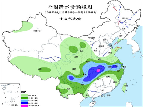 2008年8月15日8時(shí)-16日8時(shí)全國(guó)降水量預(yù)報(bào)圖