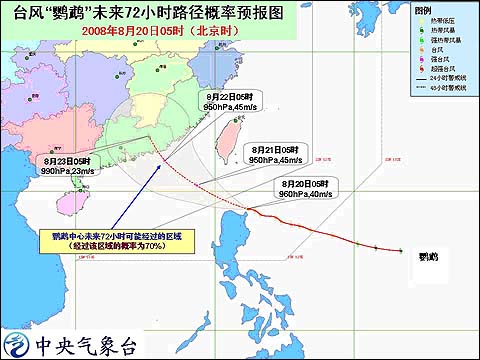 命令稱,“鸚鵡”(Nuri)的中心今天8時位于臺灣恒春市東南偏南方向約370公里的海面上,即北緯18.7度,東經(jīng)122.0度,中心附近最大風(fēng)力有13級(40米/秒)。預(yù)計,臺風(fēng)中心將以每小時15至20公里的速度繼續(xù)向西偏北方向移動,強度還將有所加強,將于今天夜間進入南海東北部海面,然后逐漸向廣東中部到福建南部一帶沿海靠近。
