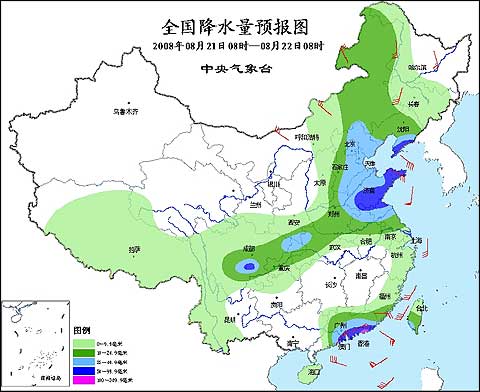 2008年8月21日8時—8月22日8時全國降水量預(yù)報圖
