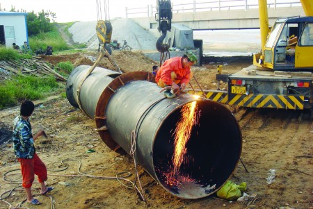 據(jù)介紹,辛安河污水處理廠排海管道全長(zhǎng)2298米,其中輸送放流管道長(zhǎng)2230米,細(xì)孔擴(kuò)散管長(zhǎng)68米,全部采用管徑為1.6米的優(yōu)質(zhì)無(wú)縫鋼管,排海管道工程于2007年8月15日按計(jì)劃開(kāi)工,在施工過(guò)程中克服了海底地形復(fù)雜、海上強(qiáng)風(fēng)大浪干擾、水下海流及流沙和雨雪冰凍等不利因素影響,在12個(gè)月的時(shí)間里完成了管道的防腐加工、水下敷設(shè)、長(zhǎng)管段對(duì)接、管溝水下開(kāi)挖的施工任務(wù)。
