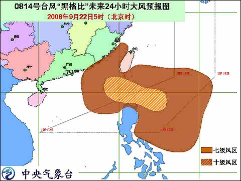 受“黑格比”的影響,今天白天到夜間,臺(tái)灣以東洋面、臺(tái)灣東南部沿海、臺(tái)灣海峽、福建中南部沿海、廣東東部沿海的風(fēng)力將逐漸加大到6-8級(jí),巴士海峽、巴林塘海峽、南海東北部海面的風(fēng)力可達(dá)8-10級(jí),“黑格比”中心經(jīng)過(guò)的附近海面的風(fēng)力可達(dá)11-14級(jí)。