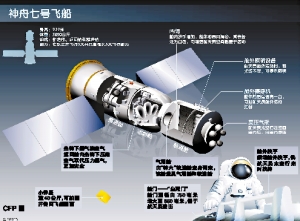 “神七”發(fā)射升空后,將在341公里的高度繞軌道漫游,就是在這個(gè)軌道高度,出艙的航天員要進(jìn)行30分鐘的太空行走。同時(shí)飛船還將攜帶的一顆小衛(wèi)星放飛太空。根據(jù)任務(wù)要求,設(shè)計(jì)師們?cè)黾恿伺撏鈹z像機(jī)、照明燈、艙外扶手、復(fù)壓氣瓶,還有各種閥門和管路系統(tǒng)等。