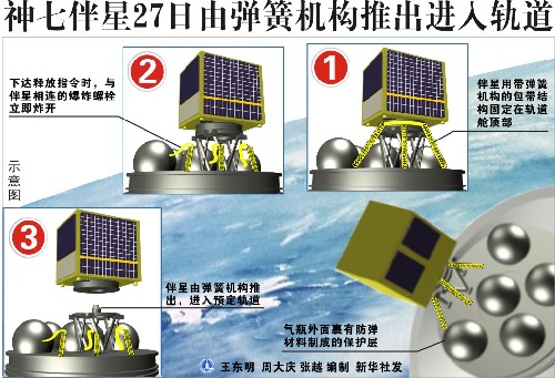 圖表:神七伴星27日由彈簧機(jī)構(gòu)推出進(jìn)入軌道 (圖片來(lái)源:新華網(wǎng))