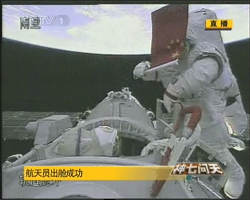 中新網(wǎng)9月27日電 神七航天員翟志剛北京時(shí)間16:43分順利出艙,劉伯明剛才將國(guó)旗遞給翟志剛,翟志剛將五星紅旗在太空中揮動(dòng)。目前,航天員出艙10多分鐘。