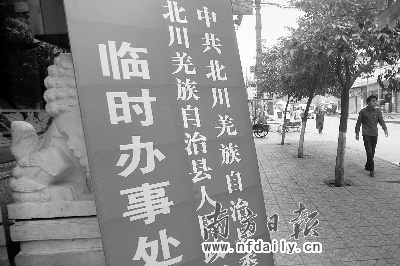 由于北川新縣城選址一直待定,北川縣委、縣政府的駐地在災(zāi)后數(shù)易其址。從最初北川中學(xué)附近的帳篷,遷至北川擂鼓鎮(zhèn)的帳篷。期間,還曾在安昌鎮(zhèn)天龍賓館的大堂設(shè)立臨時(shí)辦事處?h里的各委、辦、局則擠在旁邊的一間火鍋店里,甚至“三個(gè)單位合用一個(gè)桌子”。后來(lái)化整為零?h級(jí)61個(gè)單位分散租用安昌鎮(zhèn)的民房作為辦公地兼集體宿舍。