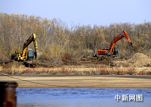 十四日晚間,黑瞎子島的江面上起了小霧,不過在撫遠(yuǎn)縣通江口仍可以看到對岸的黑瞎子島,當(dāng)時正有一批中方人員在黑瞎子島上新的邊界線附近進(jìn)行施工,直到晚上五時許,這些人員才乘船離開。目前中方正在積極鋪設(shè)通往黑瞎子島的浮橋,而一批大型機械已在十四日登島,開始修路。