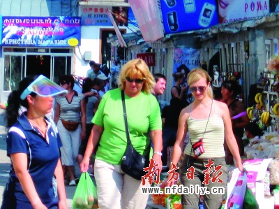 眼下,俄羅斯游客來(lái)?yè)徇h(yuǎn)即時(shí)享受者居多。俄方規(guī)定每個(gè)俄國(guó)人回境不能帶超過(guò)35公斤的物品,為此,他們?cè)趽徇h(yuǎn)盡情即時(shí)享受中國(guó)菜、中國(guó)酒,回境時(shí)盡量把買的衣服套滿全身。