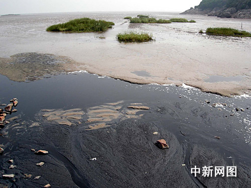 污水在灘涂上形成了一條彎彎曲曲的黑色溝渠,向大海延伸