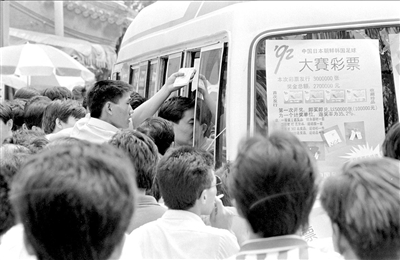 集中銷售彩票的模式開展起來。當(dāng)時(shí),福彩、體彩的人拉著電視機(jī)、洗衣機(jī)、自行車等,到農(nóng)村的集市或者城市的廣場上售賣。人們管這種彩票叫“刮獎(jiǎng)”,買到后,只需用指甲刮開,便知道自己是中了自行車、洗衣機(jī),還是一無所獲。