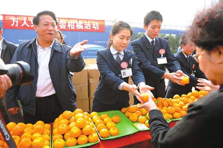 昨日(2日)上午,農(nóng)業(yè)部副部長陳曉華、副省長張作哈、省農(nóng)業(yè)廳廳長任永昌來到成都春熙路街頭廣場,帶頭吃下蜜柑,以此消除人們品嘗柑橘的顧慮。昨日由省農(nóng)業(yè)廳、成都市農(nóng)委、成都市商務(wù)局共同主辦的“萬人免費品嘗柑橘活動”在全市各大超市舉行。全省各柑橘主產(chǎn)地也同時開展了免費品嘗活動。