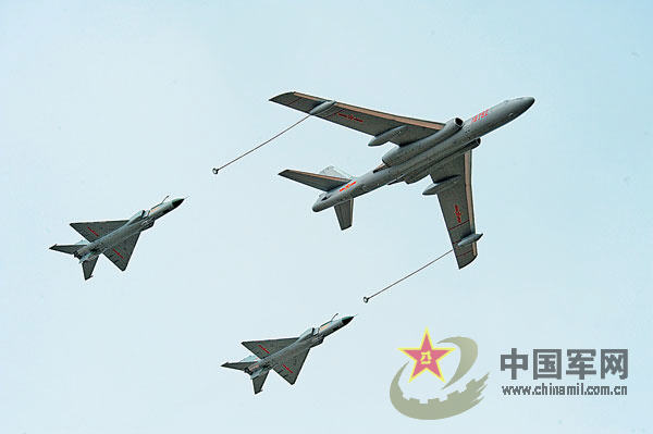率先登場的是轟油—6空中加油機(jī)。遠(yuǎn)遠(yuǎn)望去,只見3個黑點成“品”字形向觀眾區(qū)飛來。不一會兒,飛在前面的轟油—6空中加油機(jī)伸出兩根錐套式軟管,兩架殲—8D戰(zhàn)斗機(jī)略一加速縮短與加油機(jī)的距離,到約1米間隔時保持住速度,緊緊跟隨在加油機(jī)左右兩側(cè)。望著在500米高度上慢速飛來的加受油機(jī)編隊,現(xiàn)場觀眾雖然知道空中的飛行員根本聽不到地面上的聲響,但仍然報以熱烈的掌聲。