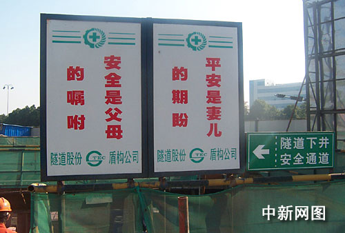 在地鐵施工現(xiàn)場(chǎng),安全標(biāo)語(yǔ)高高樹(shù)立。 作者:汪恩民