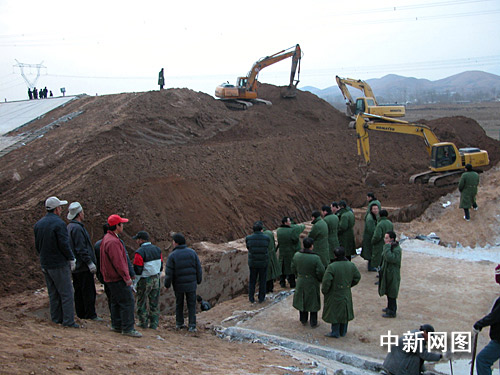 記者23日下午在現(xiàn)場(chǎng)看到,發(fā)生跑水的渠段已被從南北兩側(cè)攔截,有五六輛挖掘機(jī)正在作業(yè),干渠被截開近一丈寬的口子,渠底一條橫貫東西的水泥槽已明顯裸露出來(lái)。十幾個(gè)穿綠大衣的人站在截開的渠北側(cè),許多施工人員聚攏周圍。