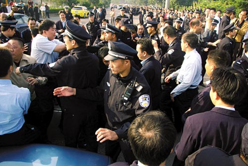 昨天上午,大批警察處置的哥圍聚事件 本報(bào)記者 林桂炎 攝