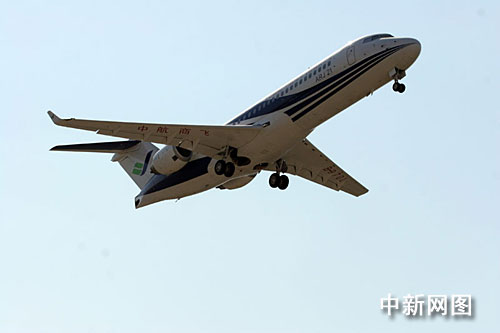 中國首架自主研制、擁有完全自主知識產(chǎn)權(quán)的新型渦扇支線客機(jī)ARJ21-700飛機(jī)28日12時(shí)20分許首次飛上藍(lán)天。中新社記者 孫自法 攝