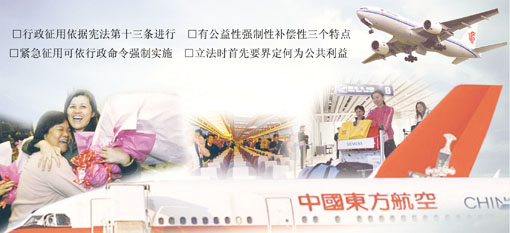 記者在采訪中了解到,我國(guó)目前沒有對(duì)行政征用進(jìn)行專門的立法,行政征用除了有憲法的依據(jù)外,還散見于其他法律法規(guī)之中,如涉及消防、抗洪、抗震等。但針對(duì)征用機(jī)場(chǎng)、客機(jī)的具體規(guī)定,還是空白。