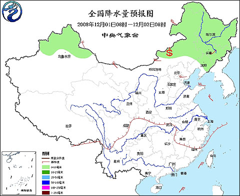 2008年12月1日8時—12月2日8時全國降水量預報圖