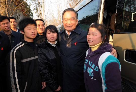 11月29日,中共中央政治局常委、國務(wù)院總理溫家寶專程來到安徽省阜陽市,看望艾滋病患者、孤兒和基層醫(yī)護人員,了解艾滋病防治工作情況。 自2003年就任總理以后,溫家寶每年都抽出時間看望艾滋病患者和孤兒。