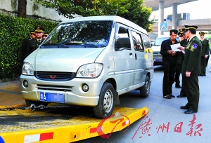 執(zhí)法人員昨日對一輛查獲的非法營運(yùn)車輛依法進(jìn)行處理。 記者王燕攝