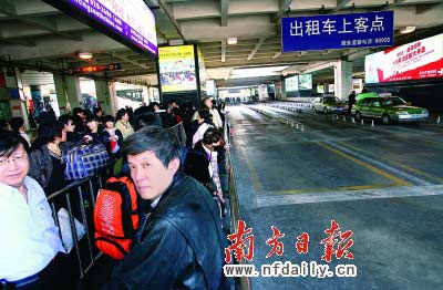 同時(shí),據(jù)天河汽車客運(yùn)站、廣州火車東站的市民介紹,出租車排著長龍等待客人的盛況均已不見。只有三三兩兩幾臺出租車,不時(shí)駛來停在候客道里。