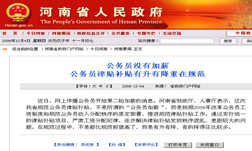 中新網(wǎng)12月4日電 河南省財(cái)政廳、人事廳今日在河南省政府網(wǎng)站回應(yīng)網(wǎng)上有關(guān)公務(wù)員開始第二輪加薪的消息,稱此次規(guī)范公務(wù)員津貼并非所謂的“公務(wù)員加薪”。