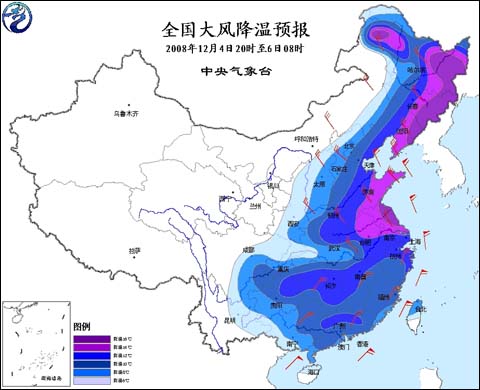 2008年12月4日18時(shí)全國大風(fēng)降溫預(yù)報(bào)圖