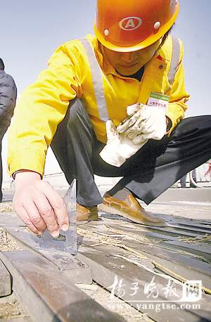 工人正在測(cè)量修復(fù)過的大橋接縫的數(shù)據(jù)!∷螎 攝
