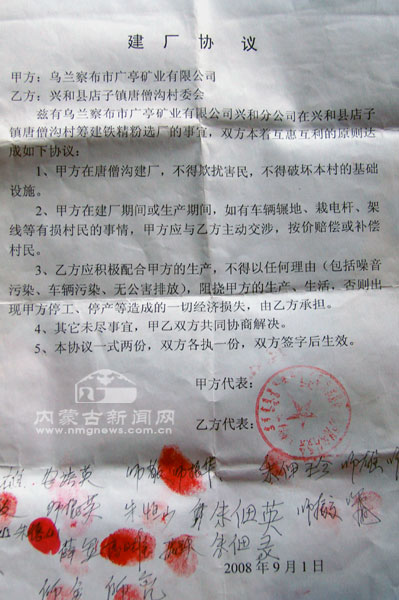 興和縣店子鎮(zhèn)蘆葦溝行政村村主任師振高與烏蘭察布市廣亭公司簽了一份協(xié)議,內(nèi)容大意是這個(gè)公司可以在當(dāng)?shù)夭设F礦,但要保證當(dāng)?shù)鼐用癜踩!這份看似毫無(wú)意義的協(xié)議卻在當(dāng)?shù)厥钟行В迕穸颊J(rèn)為這是合法的采礦企業(yè),而企業(yè)也變得更加大膽,并在村主任的協(xié)調(diào)下與村民以兩千元一畝的價(jià)格購(gòu)下了唐僧溝村舊村址,說(shuō)要建成一個(gè)大中型的鐵礦石浮選廠。