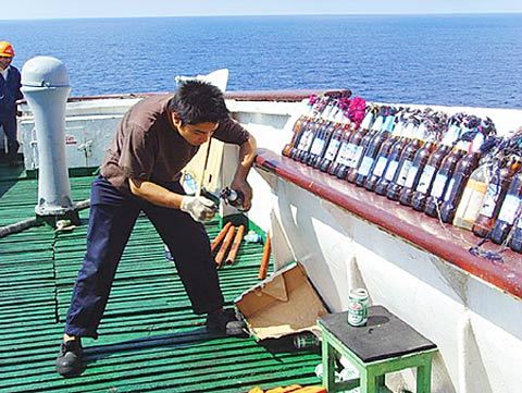 船員們搬出空的啤酒瓶,往里灌上易燃的“油漆水”,再用棉紗浸上柴油做導(dǎo)火索,準(zhǔn)備了200多只“土燃燒瓶”退敵 (照片發(fā)自亞丁灣上“振華4號(hào)”)