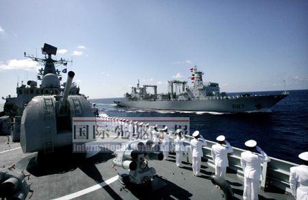 在遠洋部署方面,目前,中國海軍已經具備海上艦艇編隊“縱向”、“雙橫向”以及直升機垂直方向的補給能力,滿載排水量達到3萬噸的“微山湖”號大型遠洋綜合補給艦將為編隊提供堅實的后勤支持。2007年8月,海軍出訪歐洲艦艇編隊曾在印度洋上成功進行了航行中綜合補給。在3個多小時的航行補給中,“微山湖”號(887艦)順利為168艦補給了燃油、淡水和蔬菜食品,為艦艇編隊穿越印度洋進入紅海和地中海,完成遠航出訪任務提供了有力保障。