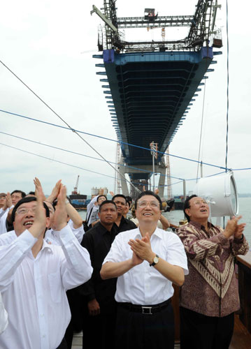 泗馬大橋是中印尼之間標(biāo)志性重大基礎(chǔ)設(shè)施建設(shè)合作項(xiàng)目。在船上,李克強(qiáng)向企業(yè)負(fù)責(zé)人詳細(xì)詢問項(xiàng)目進(jìn)展、投資概算、材料性能、用工數(shù)量及與當(dāng)?shù)睾献髑闆r。他指出,基礎(chǔ)設(shè)施建設(shè)國際合作潛力巨大。我國有實(shí)力的企業(yè)走出去,不僅可以幫助發(fā)展中國家經(jīng)濟(jì)建設(shè),促進(jìn)雙邊關(guān)系發(fā)展,還可以帶動中國原材料、設(shè)備、勞務(wù)等商品和要素出口,有利于把擴(kuò)大內(nèi)需與開拓國際市場結(jié)合起來,促進(jìn)經(jīng)濟(jì)平穩(wěn)較快發(fā)展。