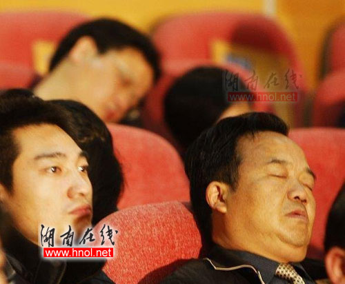 12月18日下午,湖南衡陽市在市政府會議中心隆重召開紀(jì)念改革開放30周年大會,全市上千名縣處級干部參加了會議。會場秩序井然,莊嚴(yán)肅穆,然而有極個(gè)別人竟然打起了瞌睡,與會場氛圍極不和諧。