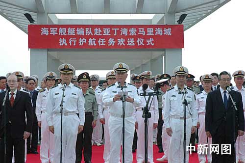 中新網(wǎng)12月26日電 由“?凇碧、“武漢”號和“微山湖”號綜合補(bǔ)給艦組成的中國海軍艦艇編隊(duì)今天下午13時45分宣布從三亞啟航,赴亞丁灣、索馬里海域執(zhí)行護(hù)航任務(wù)。中央軍委委員、海軍司令員吳勝利在歡送儀式上說,海軍艦艇編隊(duì)執(zhí)行此次護(hù)航任務(wù),是中國首次使用軍事力量赴海外維護(hù)國家戰(zhàn)略利益。