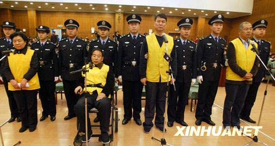 上午八時,本案開庭,能容納四百人左右的審判廳座無虛席。田文華身著印有“石市二看”字樣的黃色囚衣在兩名女法警的帶領(lǐng)下進(jìn)入法庭,神情與往常無異。同案三人均由兩名法警帶領(lǐng)進(jìn)入法庭,其中王玉良坐輪椅出庭。被訴單位三鹿集團(tuán),由工會主席冉偉光作為訴訟代表人出庭。